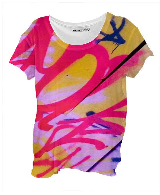 Loose fitting scoop neck shirt with nice drape and curved bottom hem.