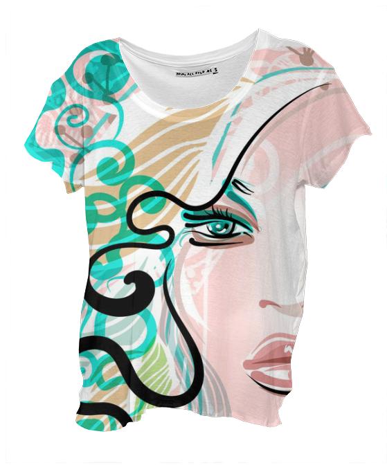Loose fitting scoop neck shirt with nice drape and curved bottom hem.