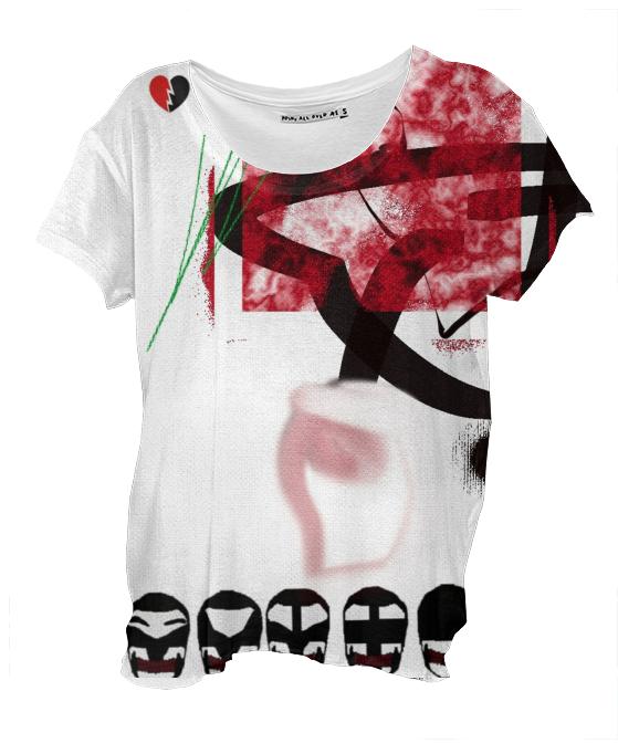 Loose fitting scoop neck shirt with nice drape and curved bottom hem.