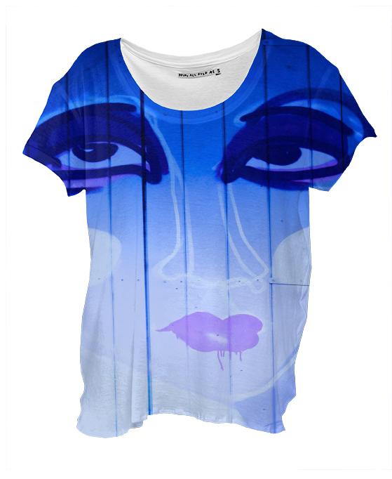 Loose fitting scoop neck shirt with nice drape and curved bottom hem.