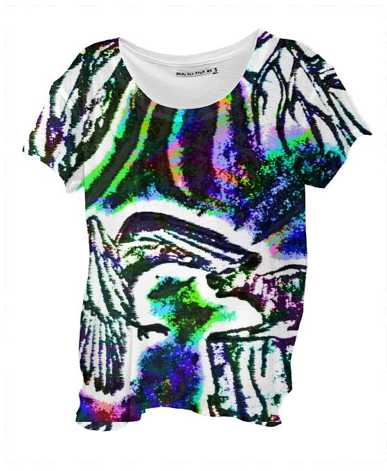 Loose fitting scoop neck shirt with nice drape and curved bottom hem.