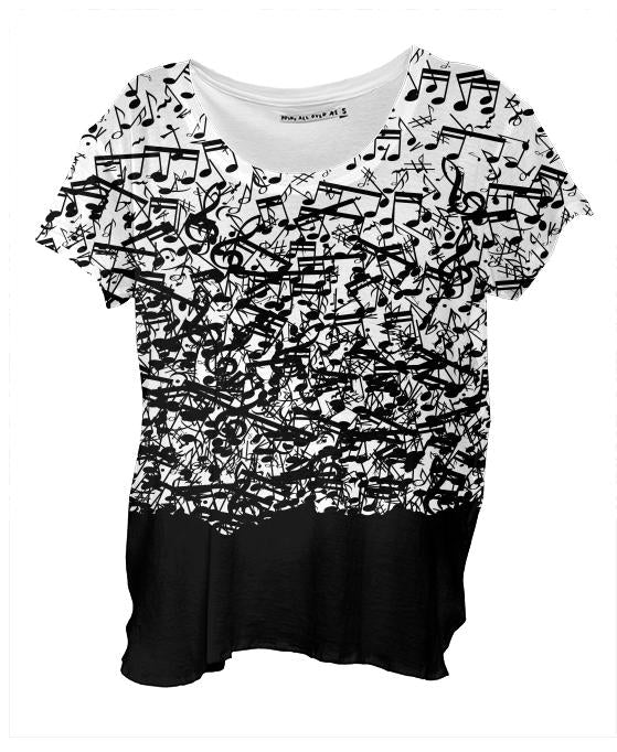 Loose fitting scoop neck shirt with nice drape and curved bottom hem.