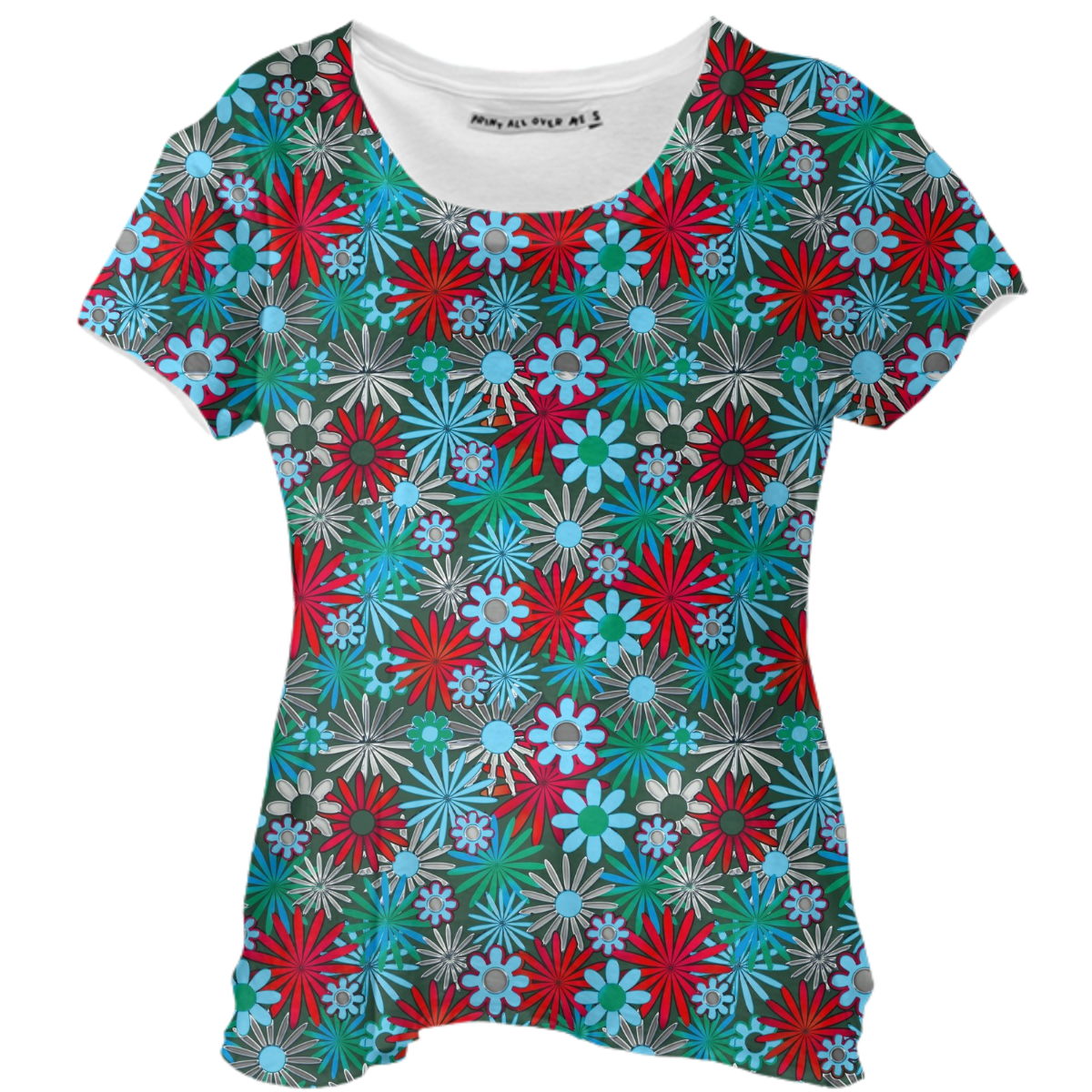 Loose fitting scoop neck shirt with nice drape and curved bottom hem.