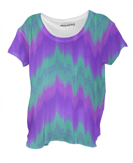 Loose fitting scoop neck shirt with nice drape and curved bottom hem.