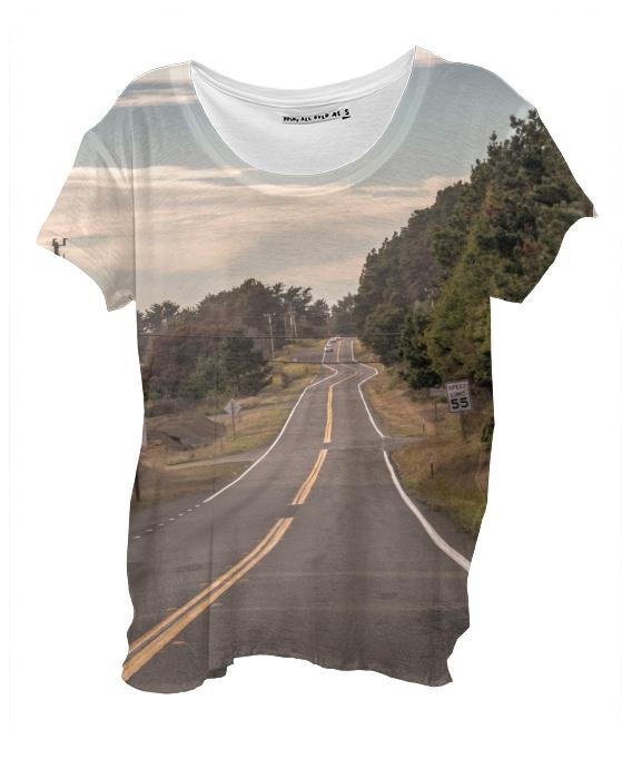 Loose fitting scoop neck shirt with nice drape and curved bottom hem.