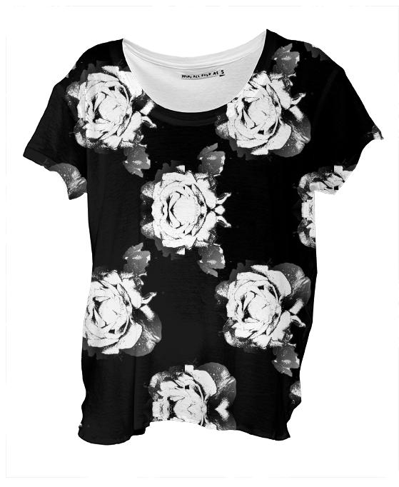 Loose fitting scoop neck shirt with nice drape and curved bottom hem.