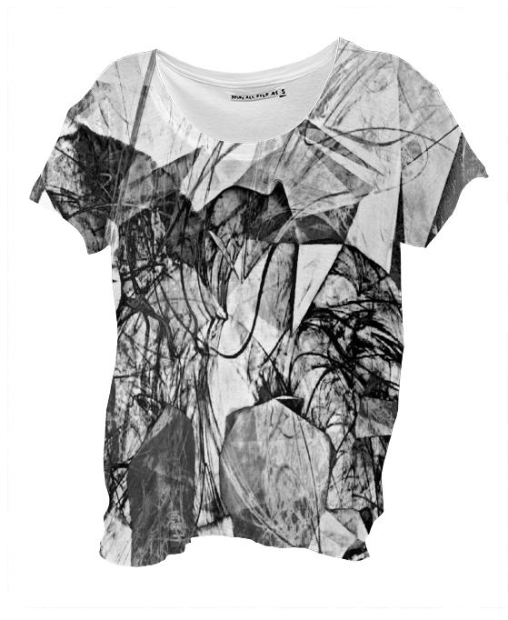Loose fitting scoop neck shirt with nice drape and curved bottom hem.