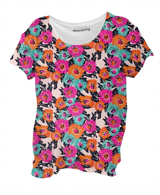 Loose fitting scoop neck shirt with nice drape and curved bottom hem.