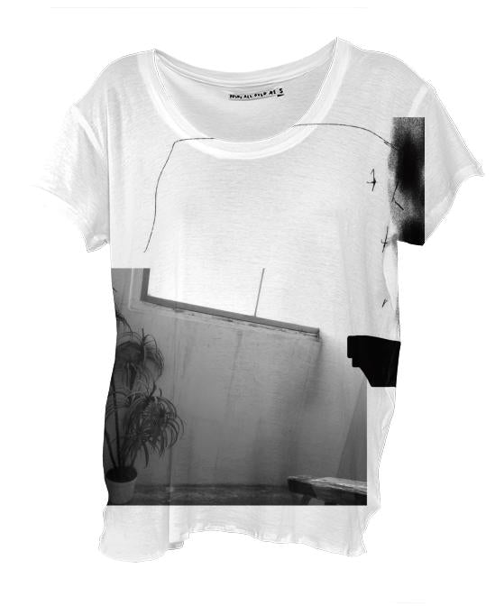 Loose fitting scoop neck shirt with nice drape and curved bottom hem.