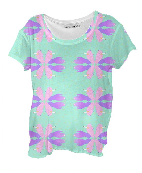 Loose fitting scoop neck shirt with nice drape and curved bottom hem.
