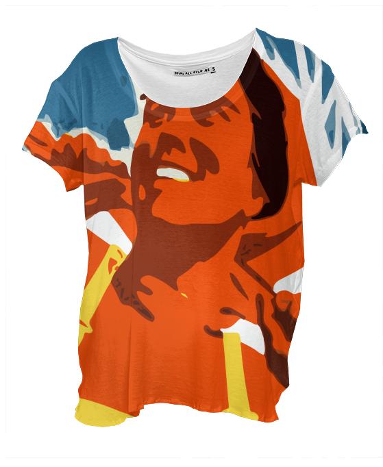 Loose fitting scoop neck shirt with nice drape and curved bottom hem.