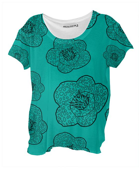Loose fitting scoop neck shirt with nice drape and curved bottom hem.
