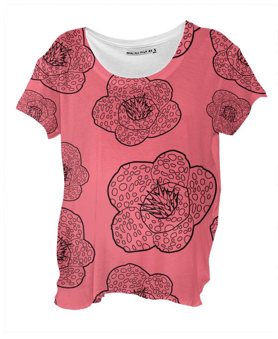 Loose fitting scoop neck shirt with nice drape and curved bottom hem.