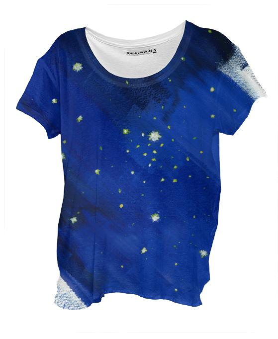 Loose fitting scoop neck shirt with nice drape and curved bottom hem.