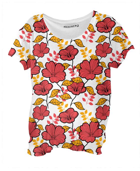 Loose fitting scoop neck shirt with nice drape and curved bottom hem.
