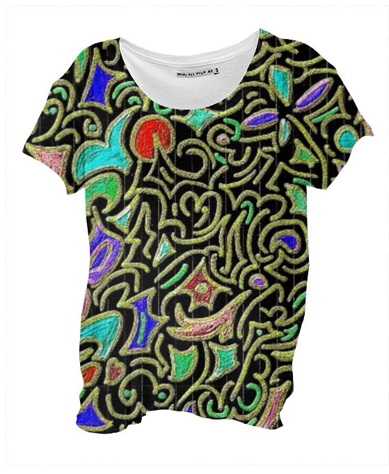 Loose fitting scoop neck shirt with nice drape and curved bottom hem.