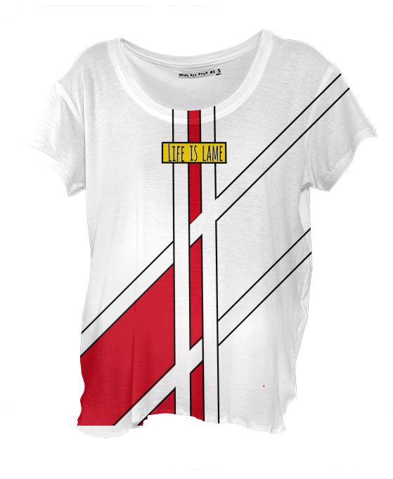 Loose fitting scoop neck shirt with nice drape and curved bottom hem.