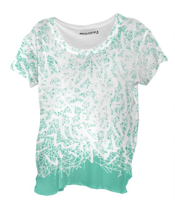 Loose fitting scoop neck shirt with nice drape and curved bottom hem.