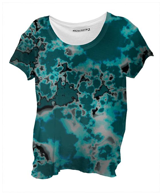 Loose fitting scoop neck shirt with nice drape and curved bottom hem.