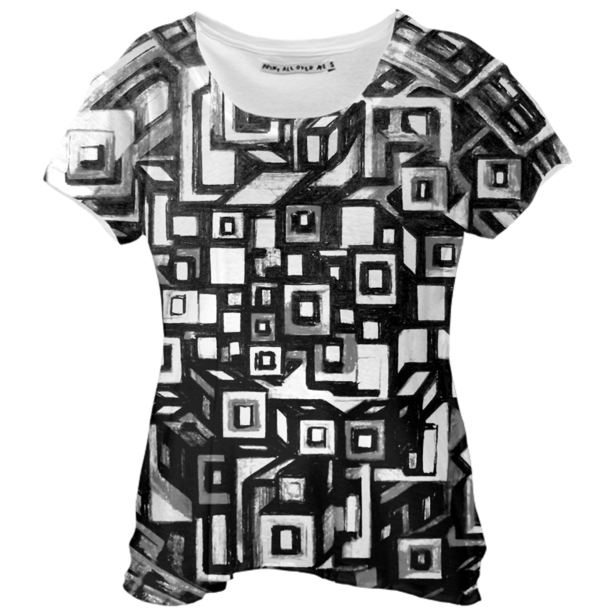 Loose fitting scoop neck shirt with nice drape and curved bottom hem.