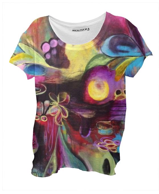 Loose fitting scoop neck shirt with nice drape and curved bottom hem.