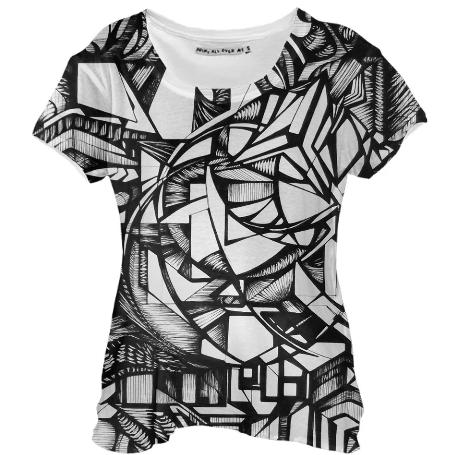 Loose fitting scoop neck shirt with nice drape and curved bottom hem.