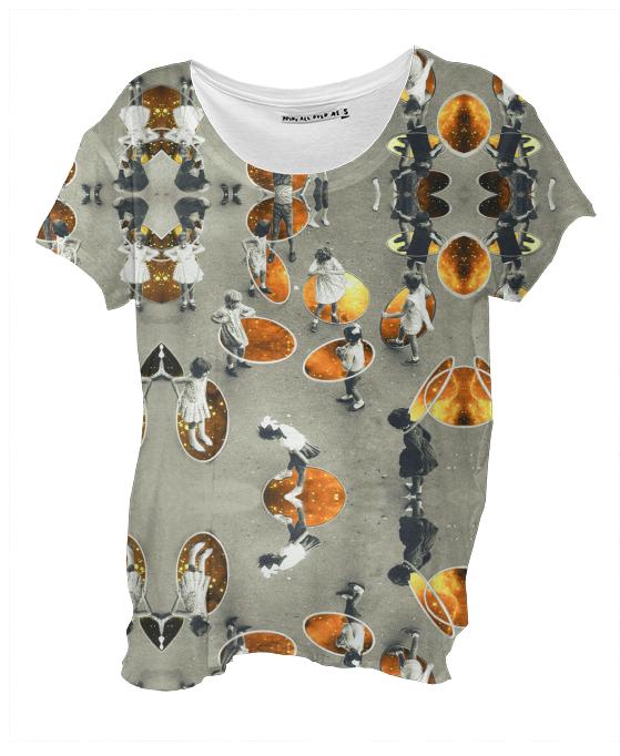 Loose fitting scoop neck shirt with nice drape and curved bottom hem.