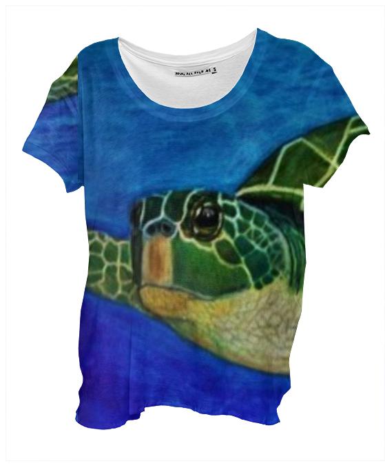 Loose fitting scoop neck shirt with nice drape and curved bottom hem.