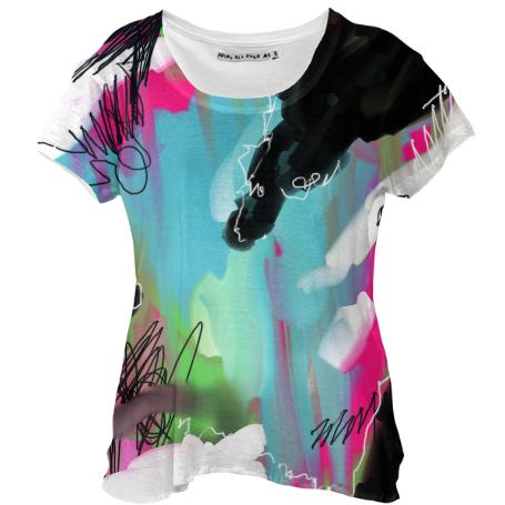 Loose fitting scoop neck shirt with nice drape and curved bottom hem.