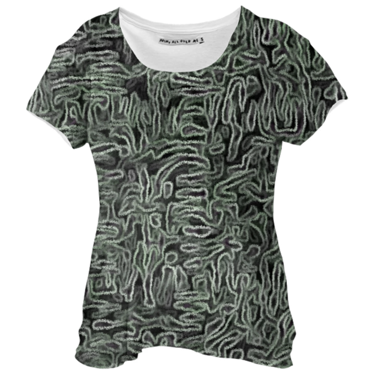 Loose fitting scoop neck shirt with nice drape and curved bottom hem.