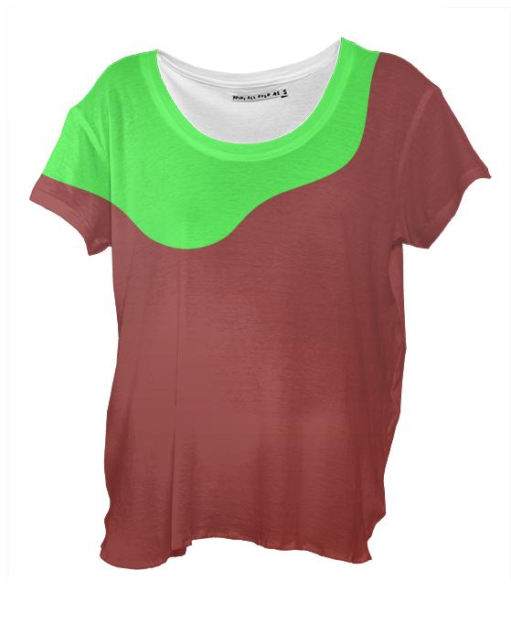 Loose fitting scoop neck shirt with nice drape and curved bottom hem.