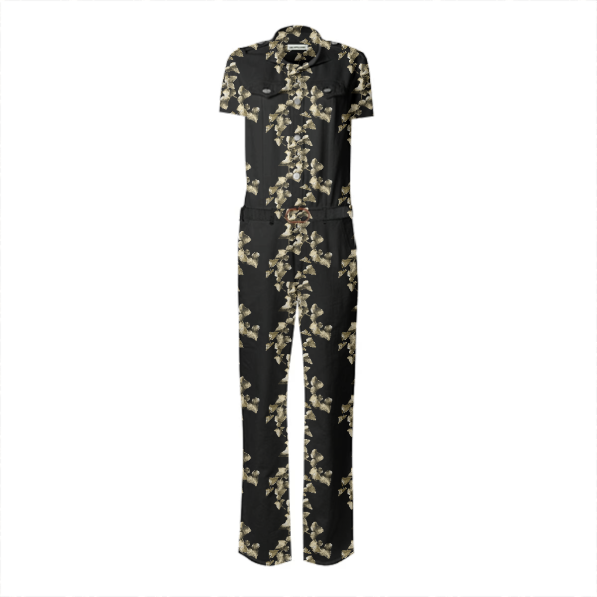 Designed by Gabriel Held this stretch belted jumpsuit is based off of the iconic Frankie B jumpsuit made famous by JLo. Features metal snaps up the front two pleated chest pockets and detachable belt.