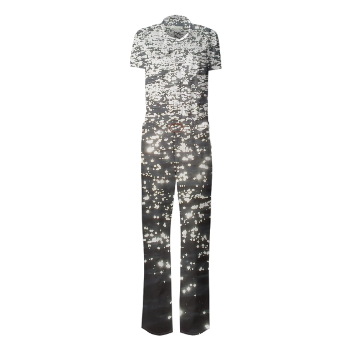 Designed by Gabriel Held this stretch belted jumpsuit is based off of the iconic Frankie B jumpsuit made famous by JLo. Features metal snaps up the front two pleated chest pockets and detachable belt.