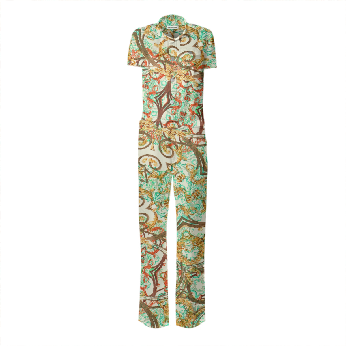 Designed by Gabriel Held this stretch belted jumpsuit is based off of the iconic Frankie B jumpsuit made famous by JLo. Features metal snaps up the front two pleated chest pockets and detachable belt.