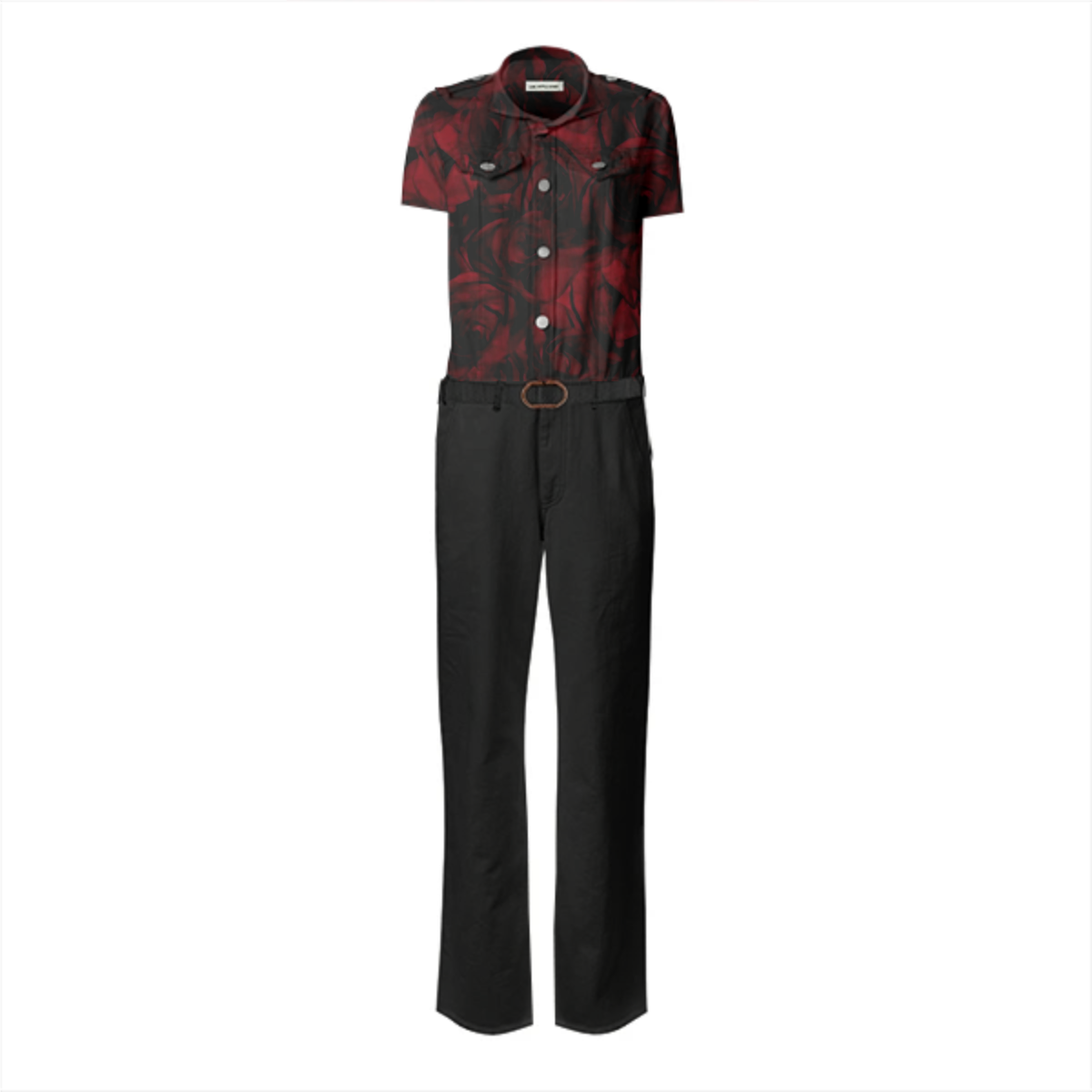 Designed by Gabriel Held this stretch belted jumpsuit is based off of the iconic Frankie B jumpsuit made famous by JLo. Features metal snaps up the front two pleated chest pockets and detachable belt.