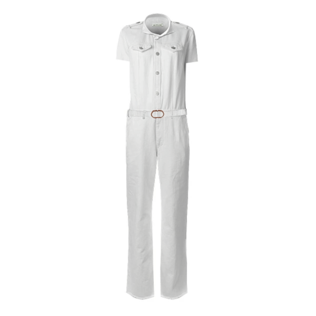 Designed by Gabriel Held this stretch belted jumpsuit is based off of the iconic Frankie B jumpsuit made famous by JLo. Features metal snaps up the front two pleated chest pockets and detachable belt.