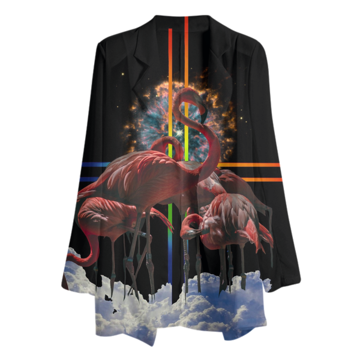 Designed by Gabriel Held this loose fit chiffon blazer features plastic buttons down the front two front flap pockets and a welt left breast pocket. Made with two layers of printed chiffon.