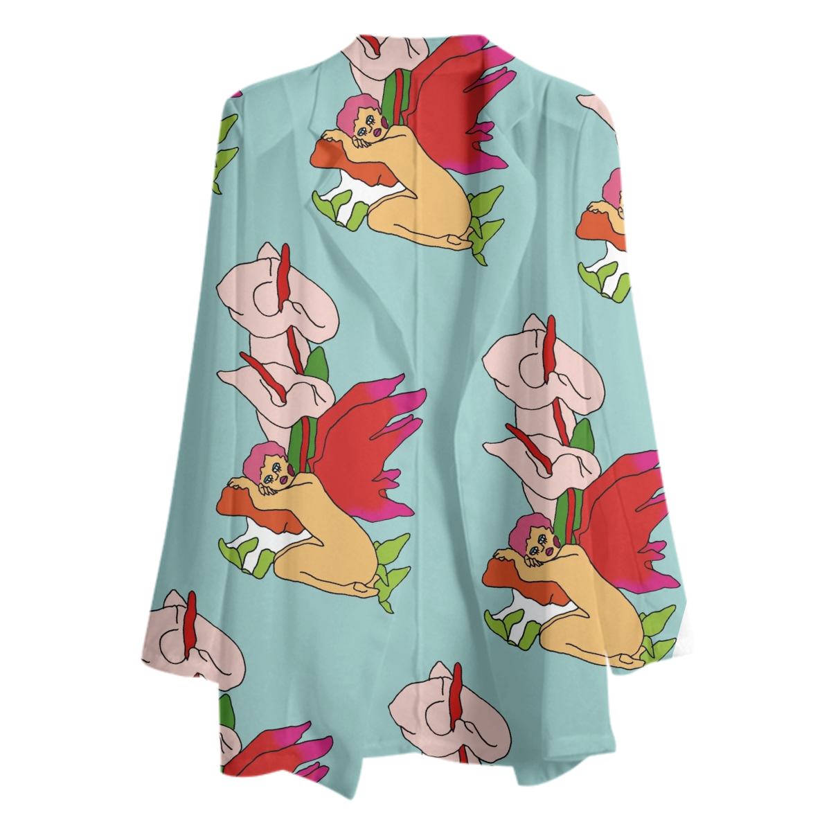 Designed by Gabriel Held this loose fit chiffon blazer features plastic buttons down the front two front flap pockets and a welt left breast pocket. Made with two layers of printed chiffon.