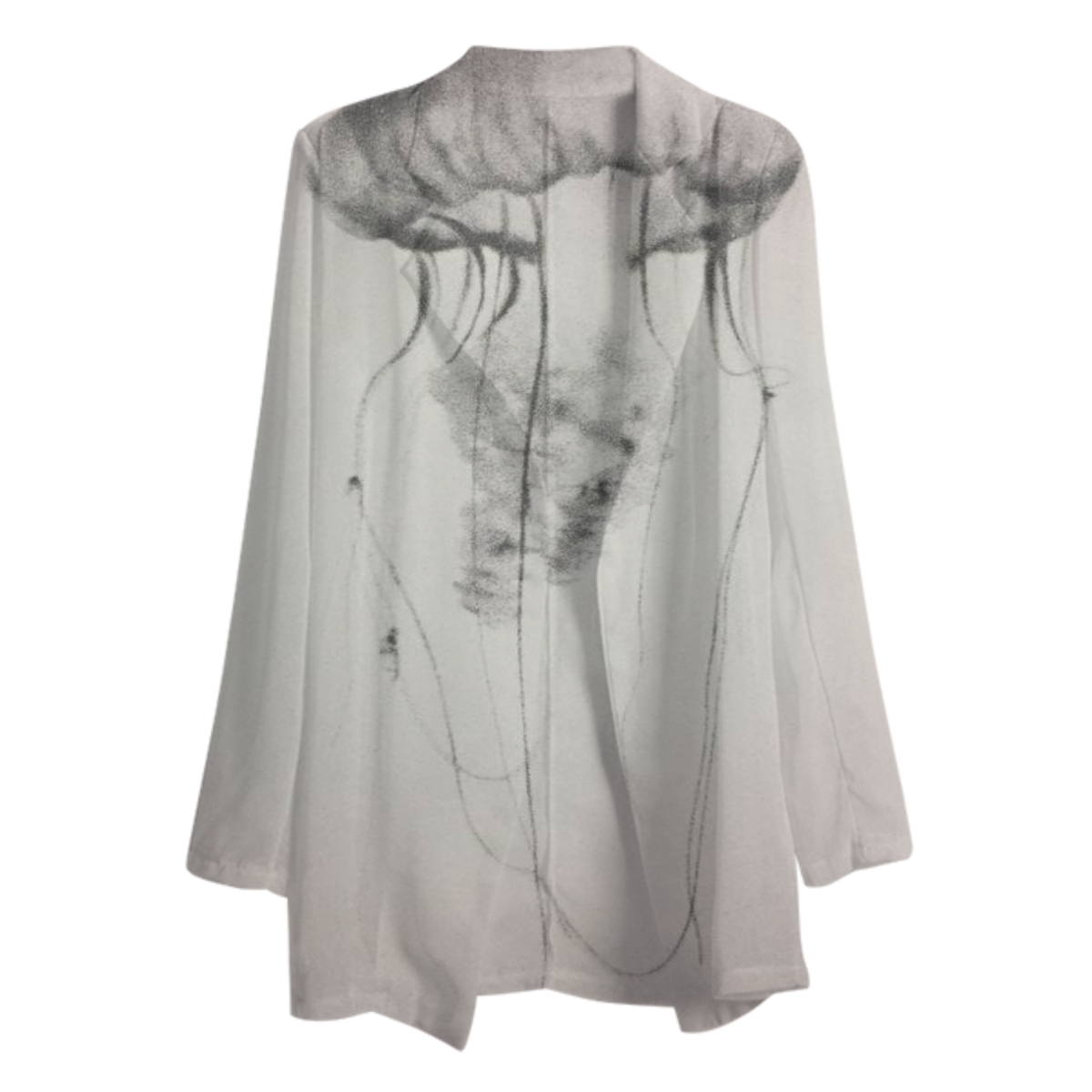 Designed by Gabriel Held this loose fit chiffon blazer features plastic buttons down the front two front flap pockets and a welt left breast pocket. Made with two layers of printed chiffon.
