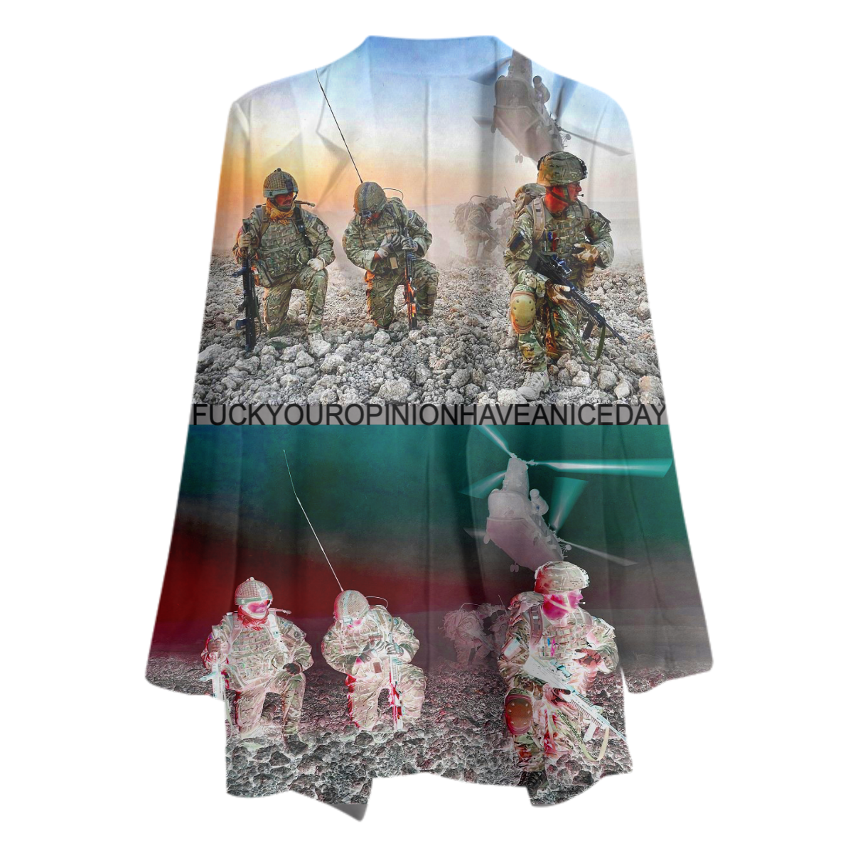 The uploaded file will be printed on the entire front and be mirrored on the back. Because of our cut and sew process some print elements on pockets seams and sleeves might not match up. For best results please upload a PNG or JPG with RGB color profile and dimensions of at least 35 inches width by 30 inches length. DPI can be as low as 72.