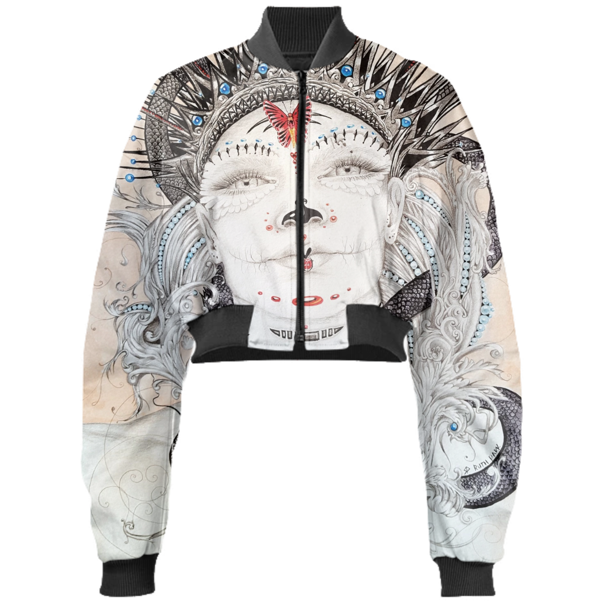 Designed by Gabriel Held this neoprene bomber jacket has a cropped fit with raglan sleeves a zip up front and two welt pockets. Matches with the Gabriel Held Mini Zip Skirt.