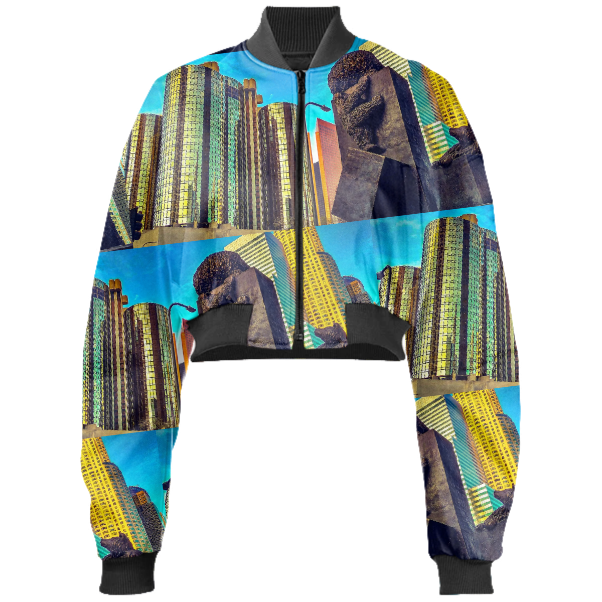 Designed by Gabriel Held this neoprene bomber jacket has a cropped fit with raglan sleeves a zip up front and two welt pockets. Matches with the Gabriel Held Mini Zip Skirt.