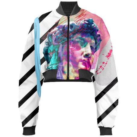 Designed by Gabriel Held this neoprene bomber jacket has a cropped fit with raglan sleeves a zip up front and two welt pockets. Matches with the Gabriel Held Mini Zip Skirt.