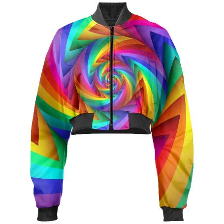 Psychedelic Rainbow Spiral Held Cropped Bomber Jacket