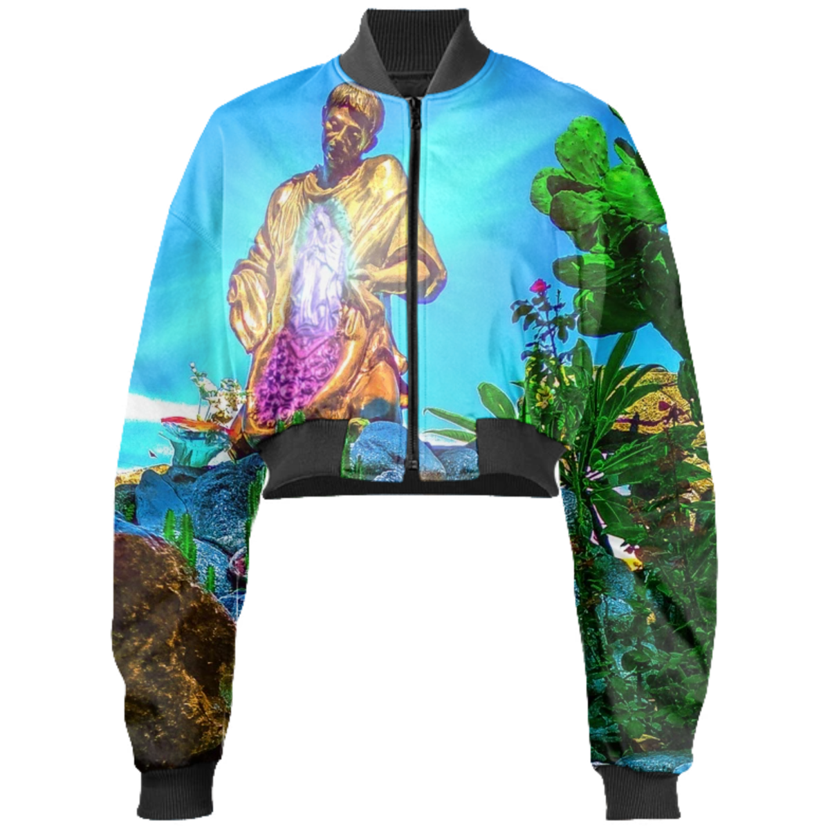 The uploaded file will be printed on the entire front and be mirrored on the back. Because of our cut and sew process some print elements on pockets seams and sleeves might not match up. For best results please upload a PNG or JPG with RGB color profile and dimensions of at least 35 inches width by 30 inches length. DPI can be as low as 72.