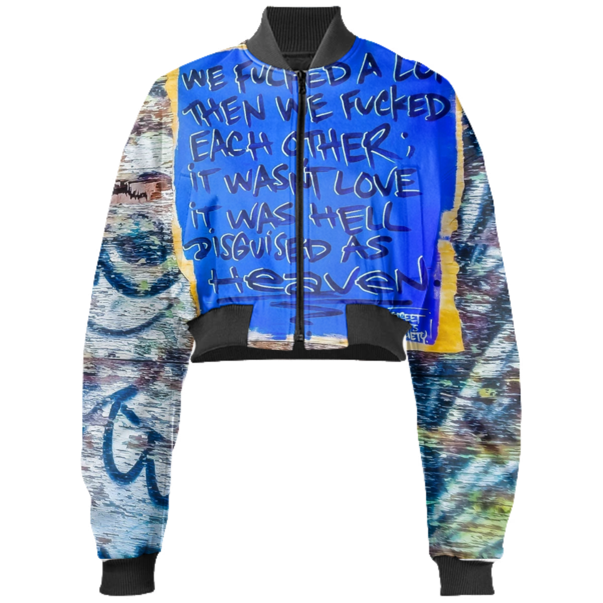 Designed by Gabriel Held this neoprene bomber jacket has a cropped fit with raglan sleeves a zip up front and two welt pockets. Matches with the Gabriel Held Mini Zip Skirt.