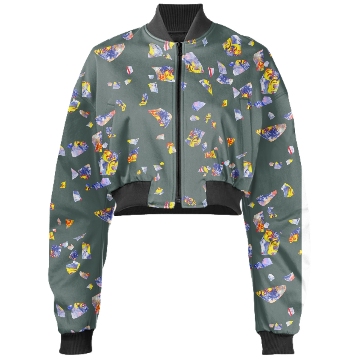 Designed by Gabriel Held this neoprene bomber jacket has a cropped fit with raglan sleeves a zip up front and two welt pockets. Matches with the Gabriel Held Mini Zip Skirt.