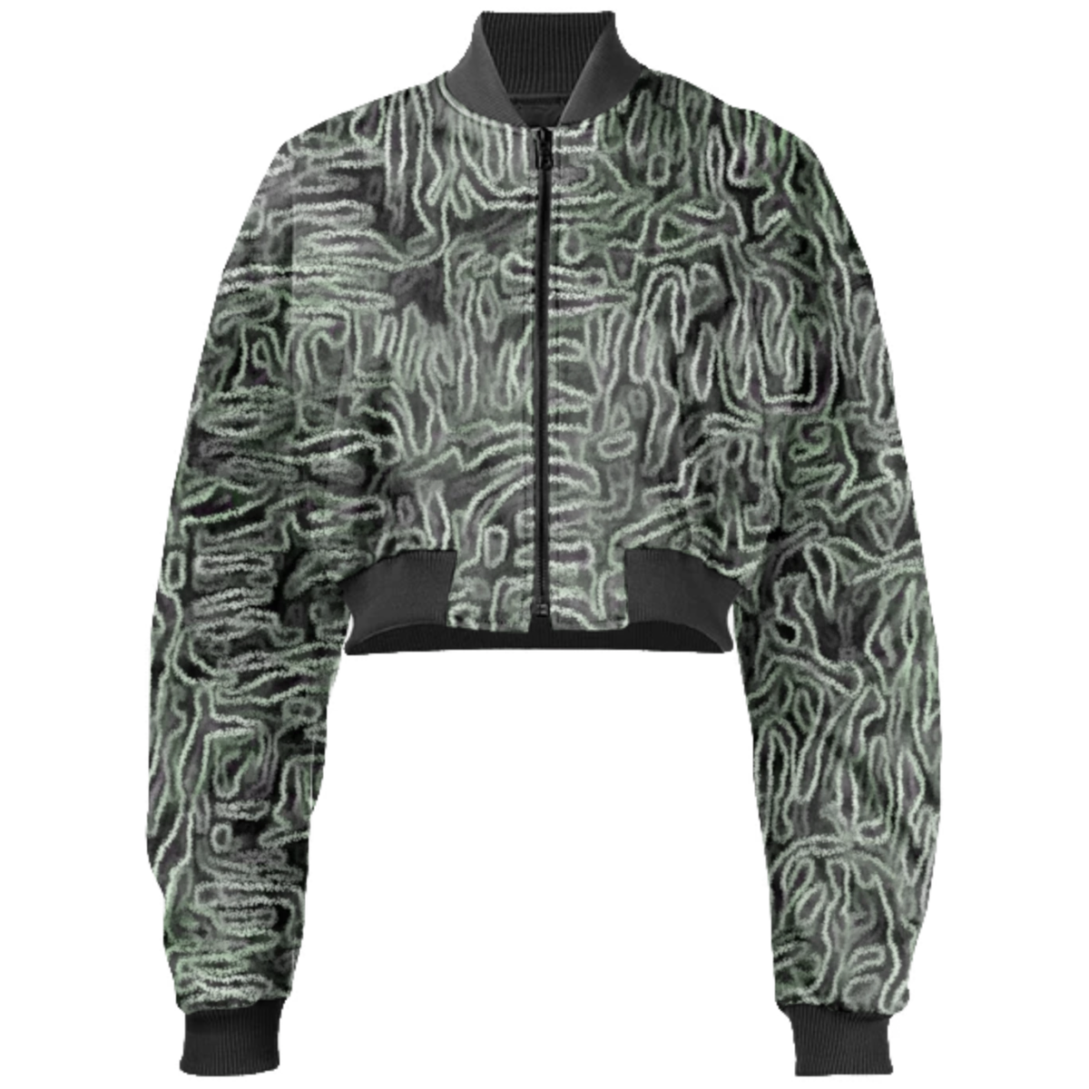 Designed by Gabriel Held this neoprene bomber jacket has a cropped fit with raglan sleeves a zip up front and two welt pockets. Matches with the Gabriel Held Mini Zip Skirt.
