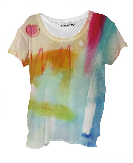 Loose fitting scoop neck shirt with nice drape and curved bottom hem.