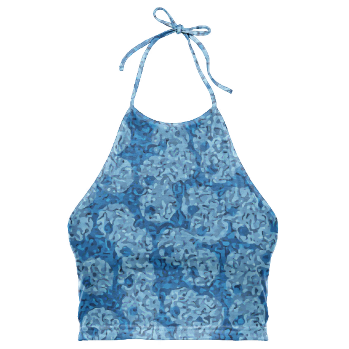 High neck halter top with adjustable ties. The back falls at the mid back and crops above the waist.